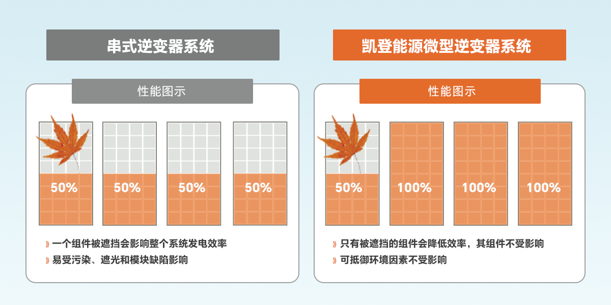 凱登能源第五代GTMI系列通訊型產品采用防水流型線設計,可以更好的為設備提供散熱功能。內置的最大功率點追蹤引擎(MPPT),可以更好地捕捉光照的變化,即使在陰雨天氣也能工作,通過它能最大程度的捕獲和收集陽光。逆變器兼容開路電壓為22~60V的多種常規(guī)太陽能面板,通過技術手段令面板發(fā)揮出它的最佳性能。 凱登微型逆變器的電力輸出模式為逆向傳輸技術,優(yōu)先將電能供應給負載,然后才將多余的電能上傳至當?shù)仉娋W(wǎng),它的轉換效率高達95%,產品擁有多項國家發(fā)明及外觀專利,并且擁有CE,CEC,ETL,INMETOR等多個地區(qū)和國家的產品認證。